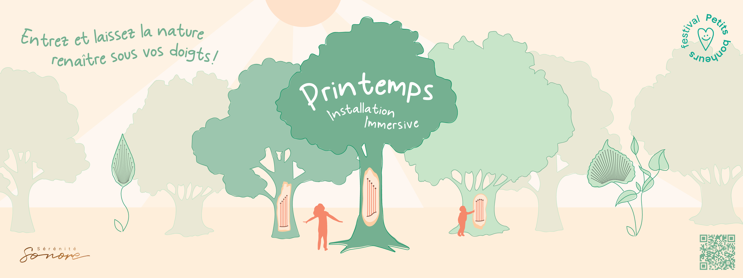 Installation PRINTEMPS : jouez avec la musique des arbres! Entrez dans une pièce lumineuse où Dame Nature vous accueille au cœur d’une forêt qui s’éveille. Les oiseaux chantent doucement sur une musique apaisante, et vos enfants peuvent toucher et jouer avec de jolis instruments en forme de feuilles : hêtre‑psaltérion et peuplier‑lyre. Un arbre décoratif, réalisé par des enfants, habille la pièce, accompagné d’un arbre à souhaits où petits et grands peuvent déposer leurs intentions. Un moment magique pour éveiller l’ouïe, le toucher et la curiosité des tout‑petits.